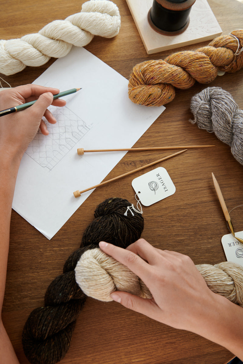 ISAGER TWEED er et entrådet garn med en blanding af uld og mohair. Garnet har et råt udtryk, men mohairfiberen i garnet er med til at gøre det bemærkelsesværdigt blødt og give et blankt skær. Garnet er velegnet til både indendørs og udendørs brug, og med sine små nister i andre farver har det en meget levende overflade. Da garnet er entrådet og derfor kun spundet i samme retning, kan det have tendens til at trække skævt, hvis der strikkes rundt på en rundpind. Vi anbefaler at strikke frem og tilbage på rundpind eller lige pinde. Strikkes der mønsterstrikning, enten som struktur, eller i Jacquardstrikning sammen med andre garnkvaliteter, vil det ikke være et problem at strikke rundt på rundpind.