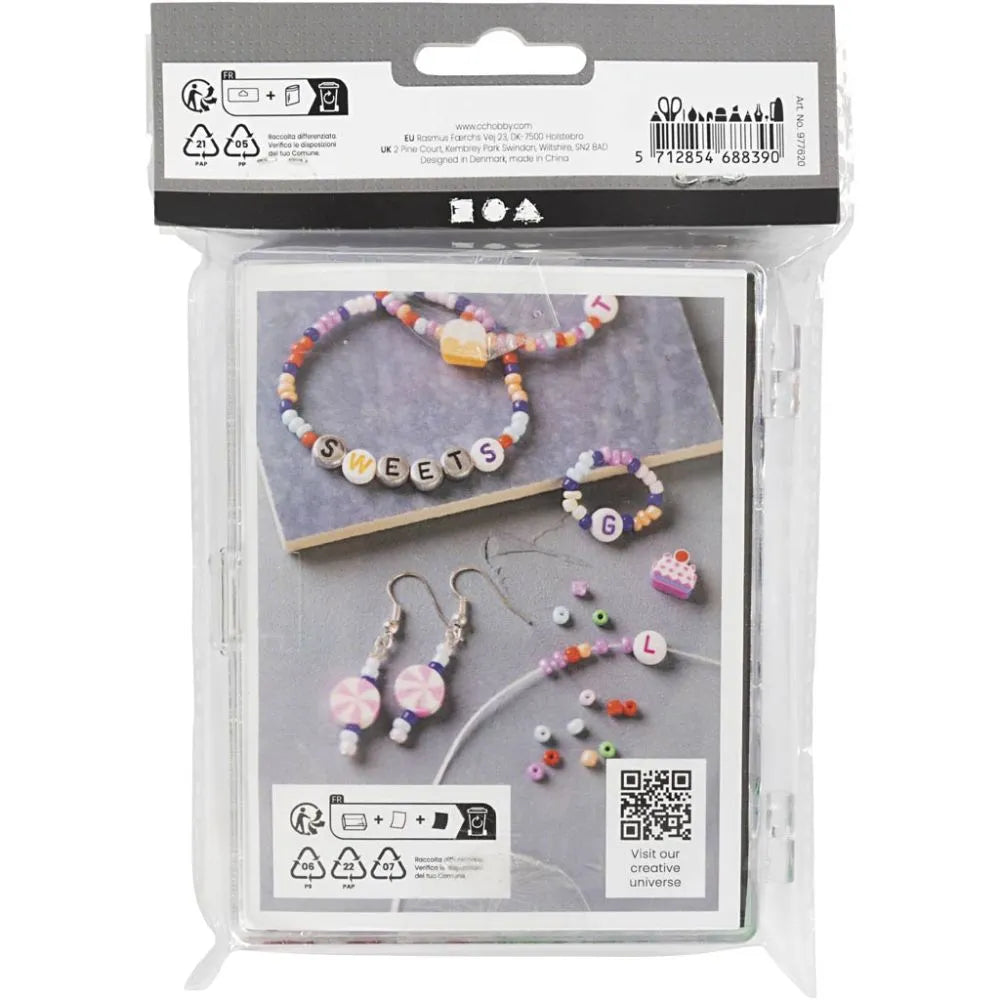 Innihald: Rocaiperler, bogstavperler, motivperler, perlestav, fransk ørekrog og smykkeelastik.